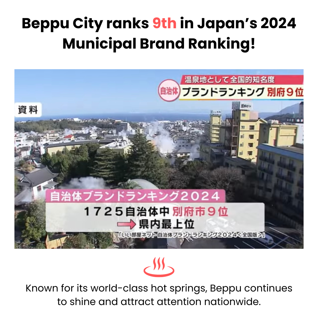 Beppu City is proudly ranked 9th in Japan’s 2024 Municipal Brand Ranking! 🏅 Our city, renowned for its legendary hot springs, continues to prove that we are one of Japan's finest! 🌟 This achievement reflects the pride and spirit of our community, and we couldn’t be prouder! Together, let’s aim even higher next year!
