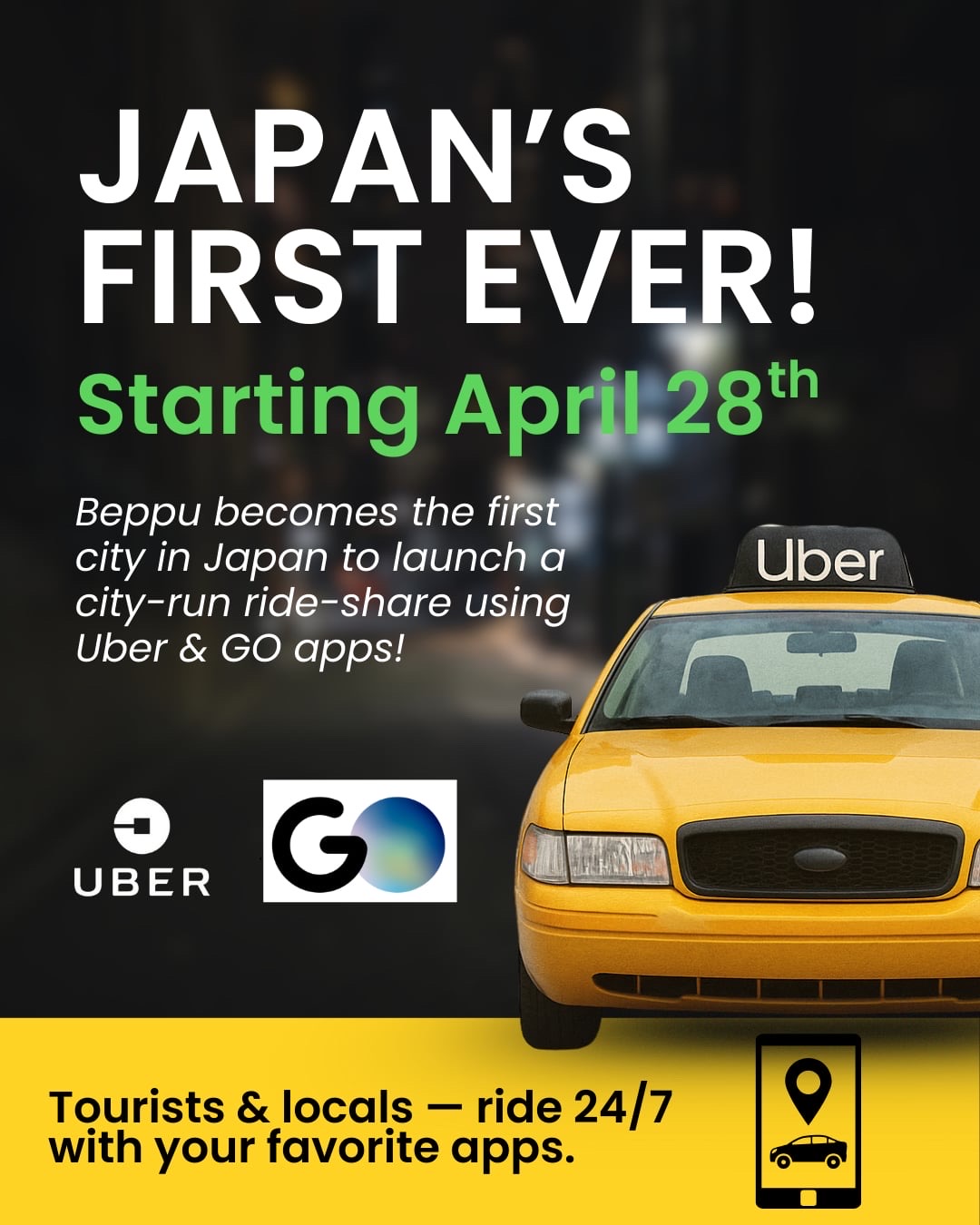 Historic Launch – April 28! Beppu is making history with Japan’s first municipal ride-share, powered by Uber and GO! Book a ride anytime, anywhere — right from your smartphone. 🌏 Yukemuri RideShare GLOBAL starts now! Recruiting Drivers for “Yukemuri RideShare GLOBAL” (A municipal‑version ride share aimed at transporting inbound tourists and other visitors) 1. Job Description Under Article 78‑2, Item 2 of the Road Transport Act, use your privately owned vehicle to transport city residents and visitors on a paid basis. 2. Operating Hours Any hours you prefer within a 24‑hour period. 3. Service Area Trips that start or end within Beppu City limits. 4. Type of Engagement • Contractor agreement with B‑biz LINK (the dispatch operator) • Passenger transport arranged via smartphone apps (Uber and GO) 5. Driver Eligibility • Aged 21 to under 70 • Hold a standard driver’s license for at least two years with no suspensions in the past two years • (All drivers must complete a safety training course after registration.) • Enrolled in voluntary insurance covering bodily injury and property damage with no limits, and passenger coverage of at least ¥30 million • (Beppu City will purchase an additional paid‑passenger transport policy on your behalf.) • Own a smartphone • Physically and mentally healthy • Able to work at least four days per month • Complete required training courses at the specified times • Commit to obeying all relevant laws and driving safely • Not affiliated with any anti‑social organizations. 6. Vehicle Requirements • Your own vehicle (subject to screening at application) • Seating capacity: 5–10 passengers, with easy rear‑seat access • Able to carry at least two large suitcases (sum of length + width + height ≤ 203 cm, capacity ≥ 90 L), including on the front passenger seat if needed • If more than eight months have passed since your last statutory inspection, complete the 12‑month inspection before starting • Must have front, rear, and in‑cab dashcams installed • Beppu City offers a subsidy for dashcam installation if you drive at least three days per month for one year • Must undergo statutory inspections every 12 months in addition to the vehicle inspection • City‑Owned Loaner Vehicles • Available by request (limited number; subject to discussion) 7. Driver Compensation & Allowances • Commission • 50 % of fare revenue • Incentives (if driving three or more hours per day during busy periods such as Golden Week or year‑end/New Year) • Daily bonus: ¥3,000 • Time‑of‑day bonuses (for shifts of three hours or longer): • 18:00–21:00: +¥500 per block • 21:00–24:00: +¥1,000 per block • 24:00–04:00: +¥1,500 per block • 04:00–08:00: +¥1,500 per block • Vehicle Maintenance Subsidy (if driving three hours or more per day): ¥1,000 per day • Fuel Cost Subsidy (if driving three hours or more per day): ¥15 per km • Dashcam Installation Subsidy (conditions apply) 8. Required Application Documents • Copy of vehicle inspection certificate • Copy of both sides of driver’s license • Copy of voluntary insurance certificate (showing policyholder and coverage details) • Documents verifying any preferential qualifications (if applicable) • Any additional documents requested by the contractor 9. Selection Process • Document screening and interview 10. Other Notes • Each driver is responsible for filing their own income tax returns. • Operating expenses (fuel, maintenance, smartphone fees, etc.) are borne by the driver, except where covered by allowances or subsidies above. • Required on‑vehicle equipment (signage, payment devices, etc.) will be provided. • If you do not hold a Class 2 driver’s license for larger vehicles, you must complete a minister‑approved training course as directed by the contractor (B‑biz LINK). Beppu City will cover this training cost unless you cancel registration within one year (except when deregistering due to university graduation). • Keep your vehicle clean at all times; cleaning costs are your responsibility. • If using a city‑loaned vehicle, you must pick it up and return it to the storage location at your own expense. • Workdays must be coordinated in advance with B‑biz LINK. • Please consult your employer before applying. Please note: This information is subject to change without prior notice.